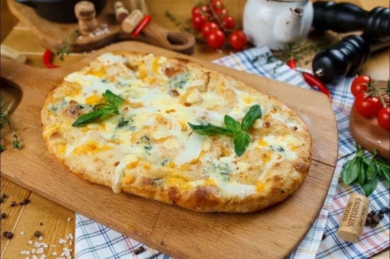 Римская пицца, сыр чеддер, пармезан, моцарелла, дор блю, соус сливочный