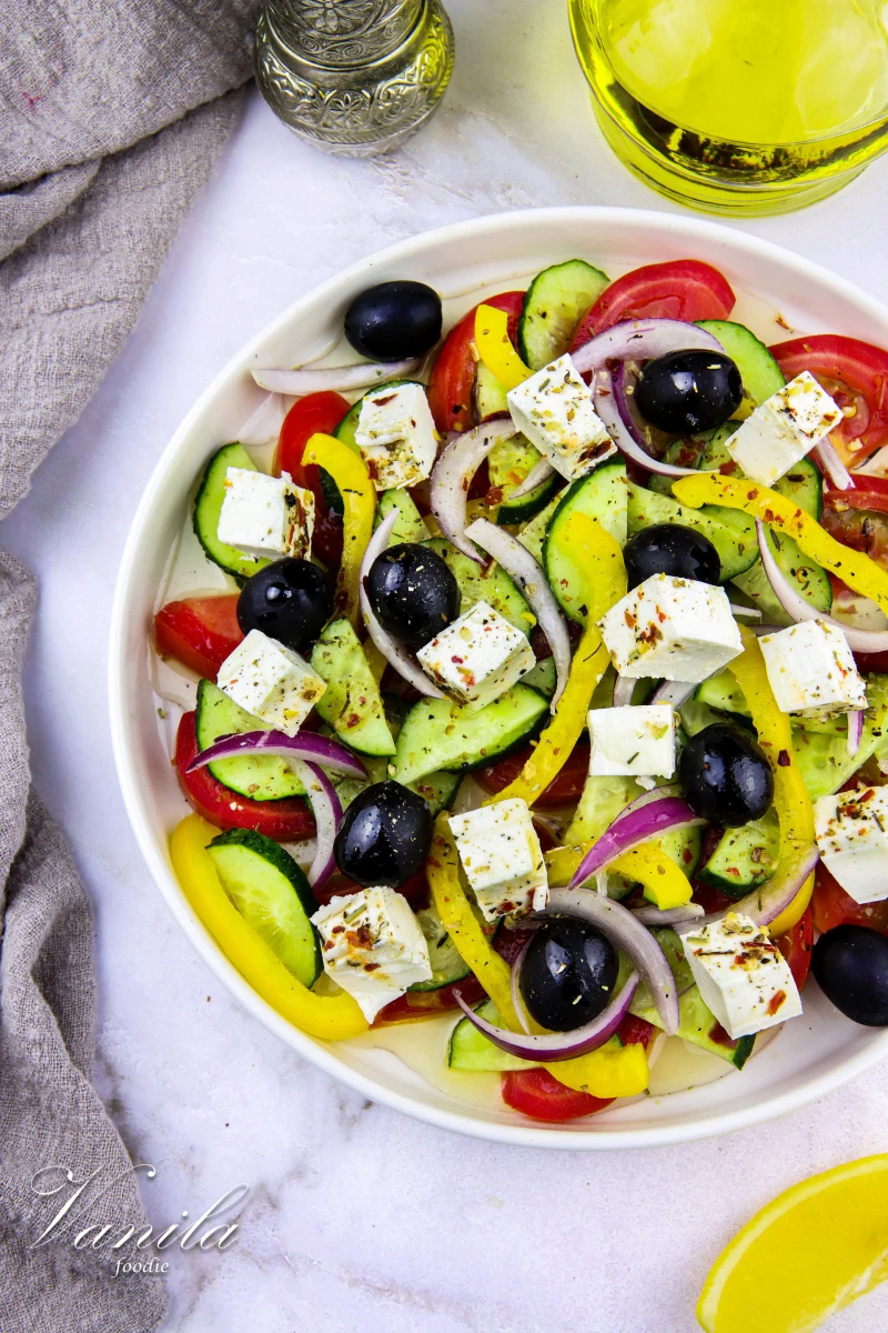Сыр фета, Помидоры, Огурцы, Салат айсберг, Молотый перец, Соль, Маслины, Оливковое масло