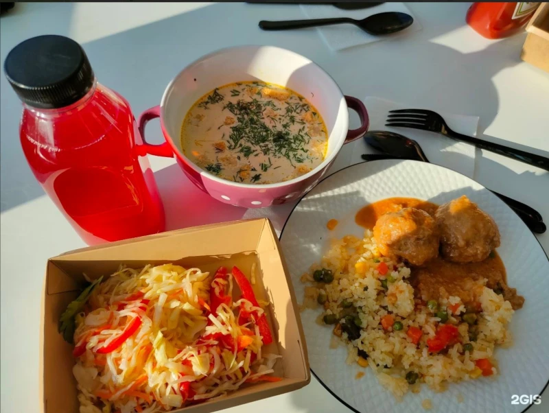 Суп дня, гарнир дня, котлета или курица, салат витаминный, чай, хлеб. Состав каждый день незначительно меняется